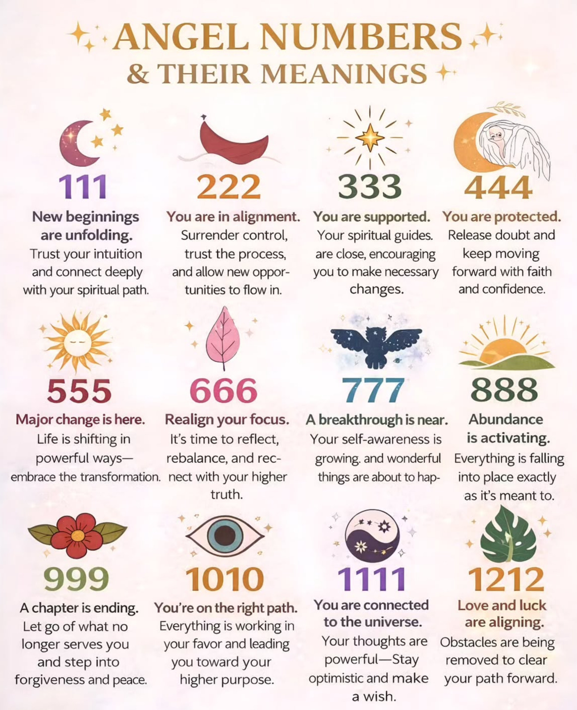 There are a few charts floating around the internet that decode angel numbers, and this is the one I’ve chosen to screenshot and refer back to when I need a refresher for what each particular sequence means.